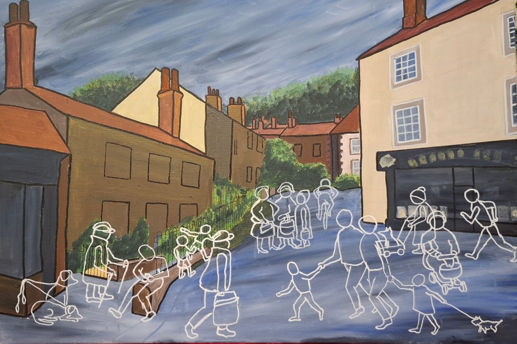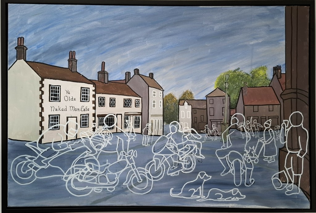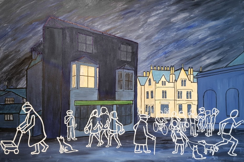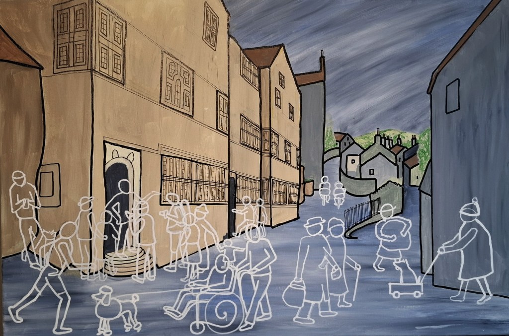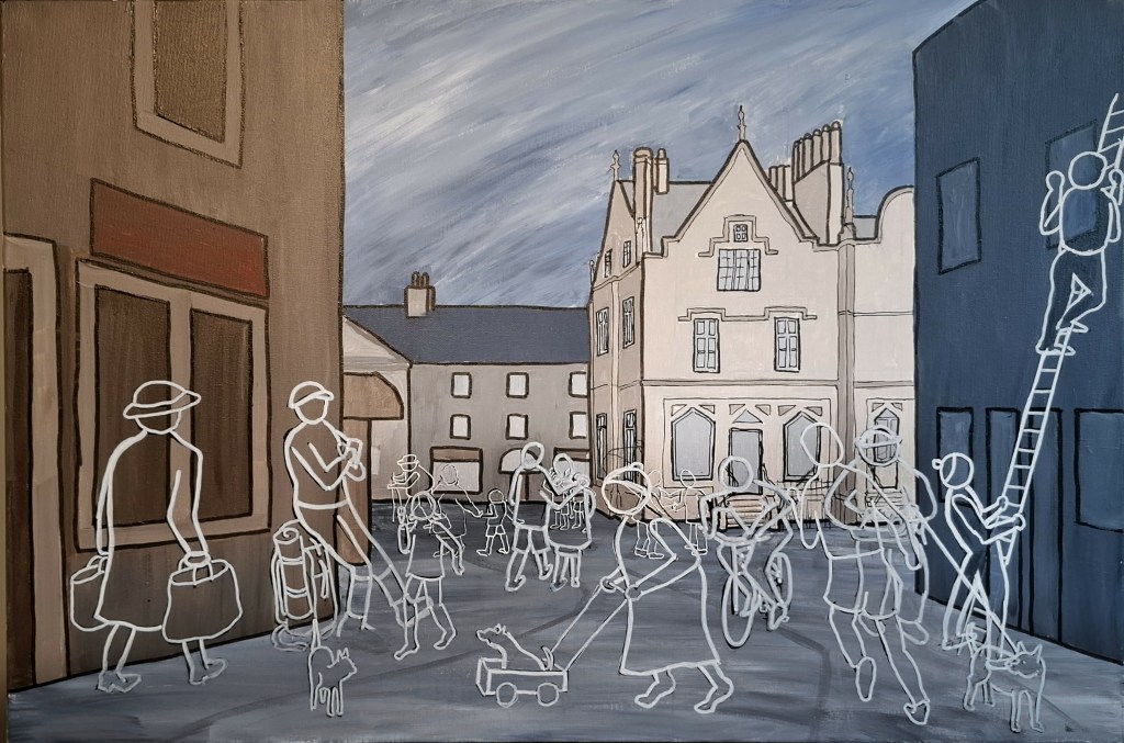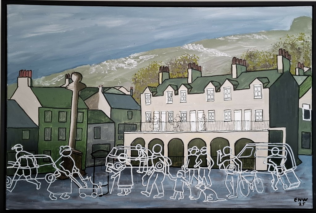 This series of painting are based around the centre of Settle. I have always been an admirer of Patrick Caulfield’s precise drawings all outlined in black some coloured but others not. In addition, there is an influence in my work of the Cumbrian artist Percy Shaw. I like the way his landscapes, and particularly buildings, are represented but with a minimum of detail. These images of mine have been inspired by those artists. However, I have put my own ideas in here also. The static buildings show colour as an positive statement about the location. The figures, however, are moving, and have an ephemeral appearance. These are the images of the people who may have passed by the location either now or in the future.